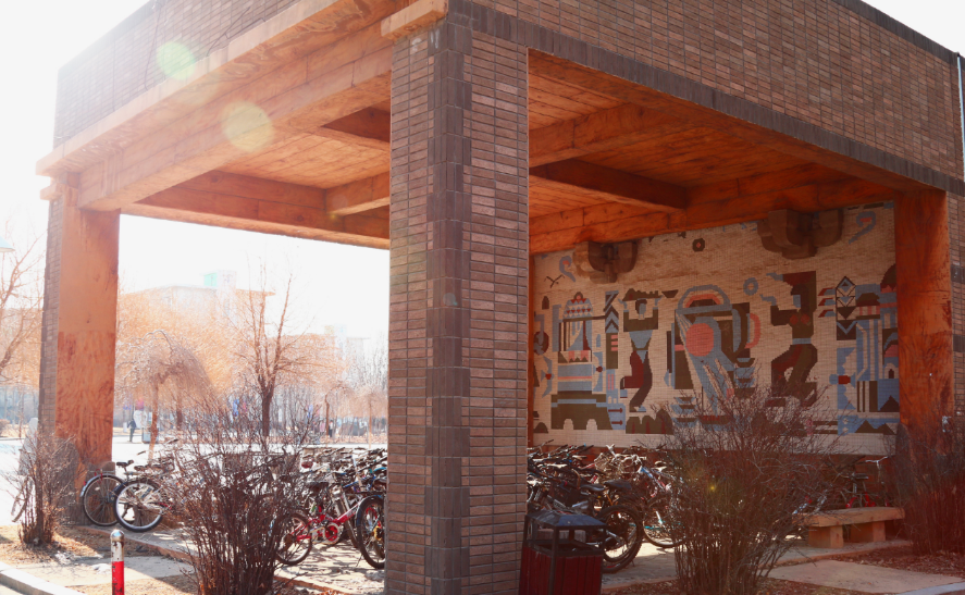 壁画的下方是108块老校区建筑保留下来的红砖,这种用古今交融的理念建造的“小木屋”,表达了建大人对古代建筑与现代建筑融合的思考。